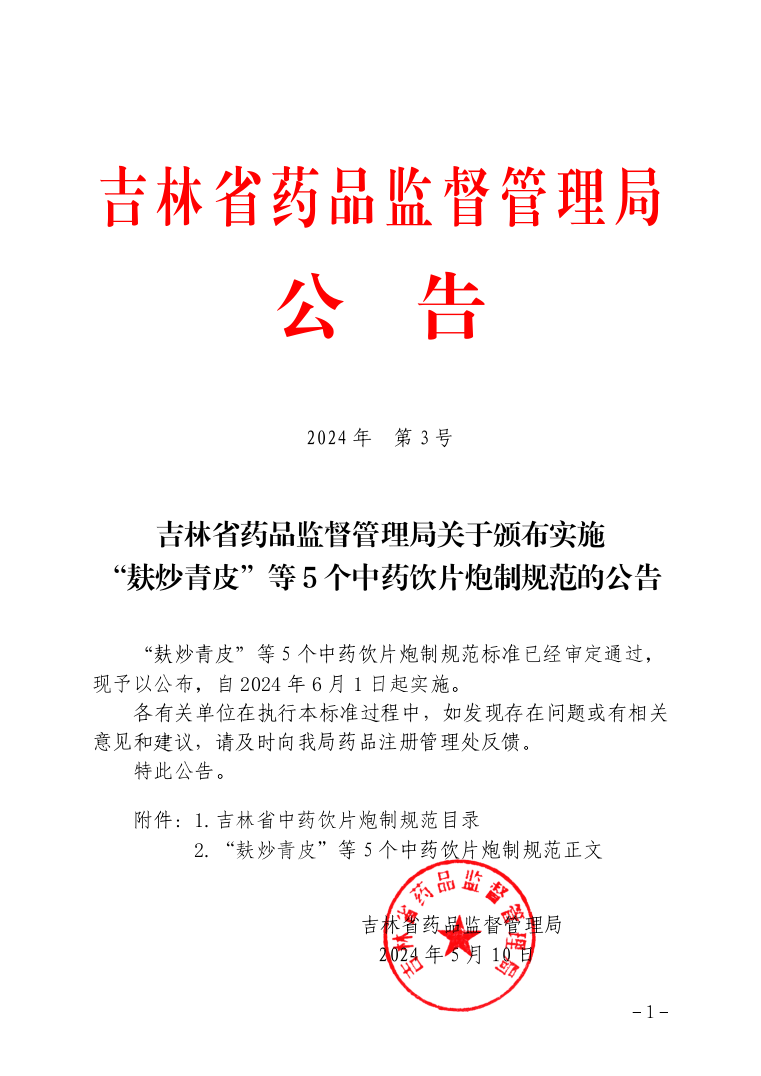 918博天堂关于颁布实施“麸炒青皮”等5个中药饮片炮制规范的公告