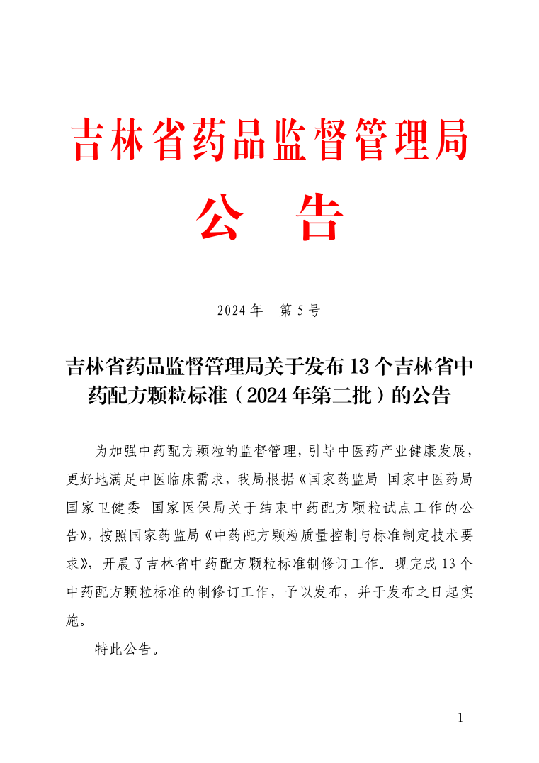 918博天堂关于发布13个吉林省中药配方颗粒标准(2024年第二批)的公告