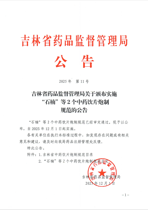918博天堂关于颁布实施“石楠”等2个中药饮片炮制规范的公告 2025年第11号
